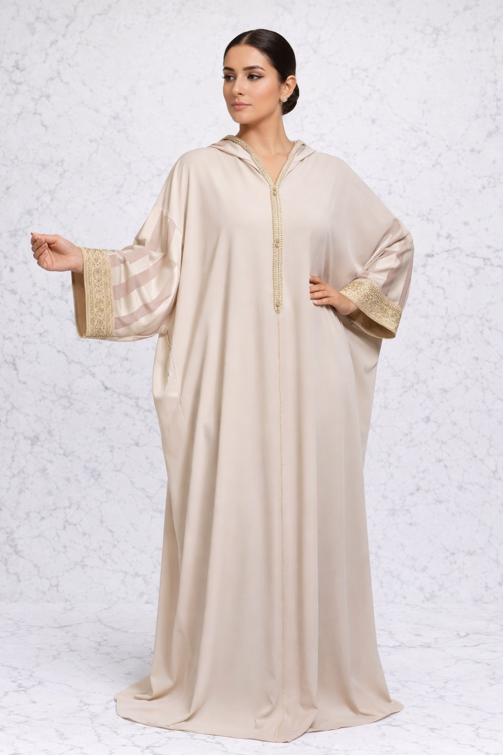 Cette djellaba fluide séduit par sa coupe ample et confortable, idéale pour toutes les morphologies. Ses manches satinées semi-transparentes apportent une touche raffinée et moderne, tandis que les boutons décoratifs dorés sur le devant ajoutent une finition élégante.