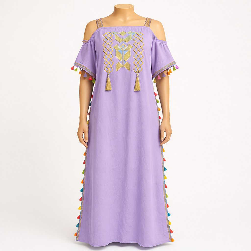 Laisse-toi séduire par cette gandoura légère et fluide, inspirée de l’artisanat marocain. Son motif berbère brodé apporte une touche authentique, tandis que les pompons délicats ajoutent du charme et du mouvement à chaque pas.