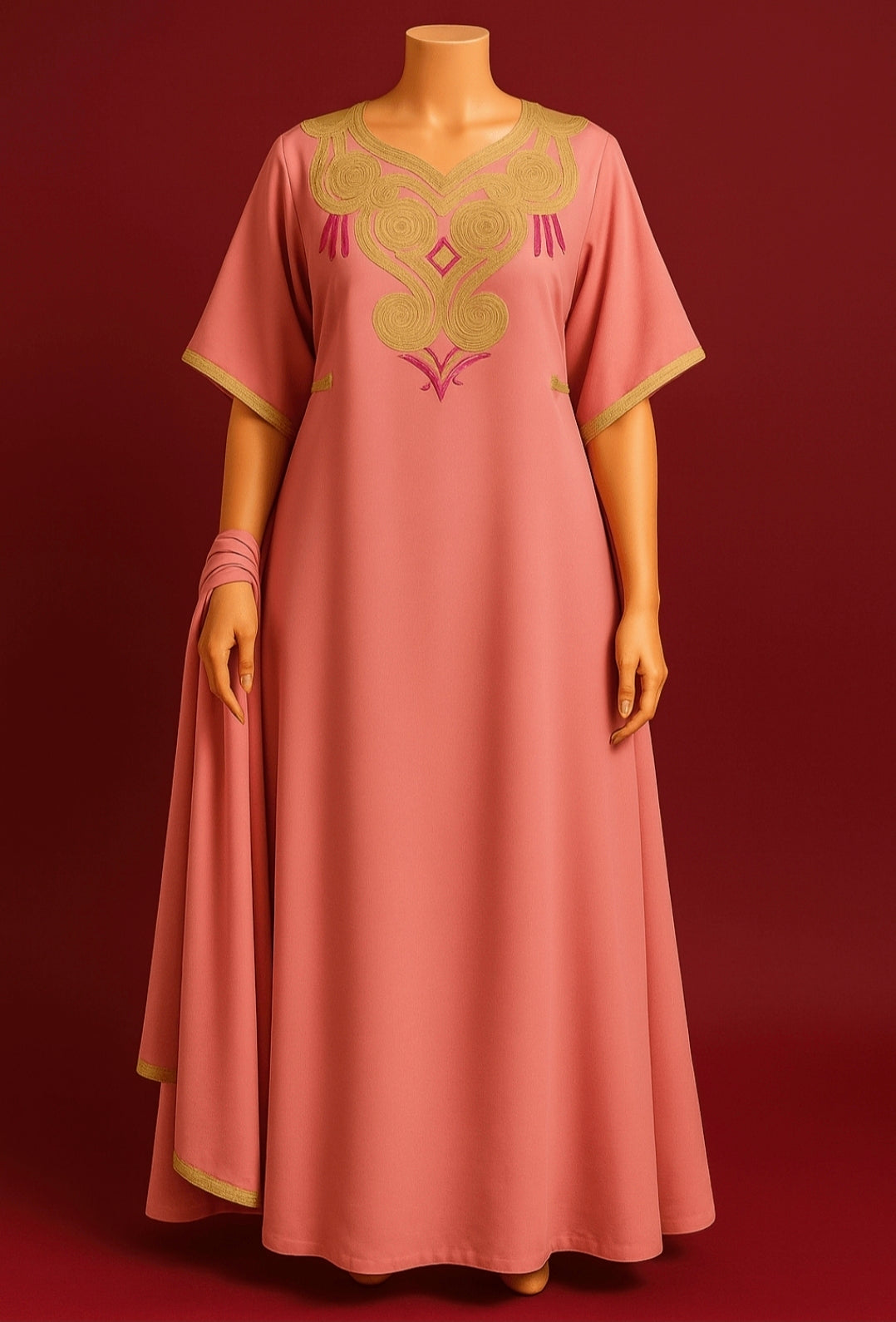Son col en V travaillé met en valeur le buste avec élégance, tandis que ses manches amples et sa coupe longue offrent un tombé majestueux et un confort absolu. Les finitions dorées au niveau des manches et de l’ourlet ajoutent une touche luxueuse qui fait toute la différence.